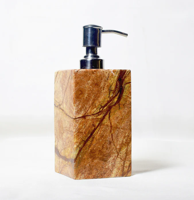 A stunning Rainforest Brown marble dispenser that adds organic charm and elegance to your countertop.